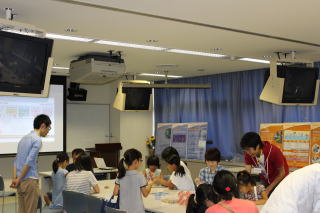 キャタリシス スクエアは研究開発センター共同研究棟の2階の一室をお借りし、岐阜大学近江先生にも助けていただいて開催した。会場では、24枚の触媒紹介パネルと研究室で所有しているハニカム触媒やDPF、ペレット触媒などの展示(図2)、およびCatalysis Parkのビデオ上映を行った。また、子供たちを対象にゼオライト模型の作製も行った。「なごや・サイエンス・ひろば2014」では60ものイベントが開催されているため、キャタリシス スクエアへの来場者は保護者を含めて200名程度と予想していた。10時開場後の1時間程度は、来場者数も想定範囲内で、ゼオライト模型の製作や興味を持って頂いた小学生や保護者へのパネルや触媒の展示物への説明を行うことができた(図3)。しかし12時前頃になると、全体の参加者数の増加に合わせて、キャタリシス