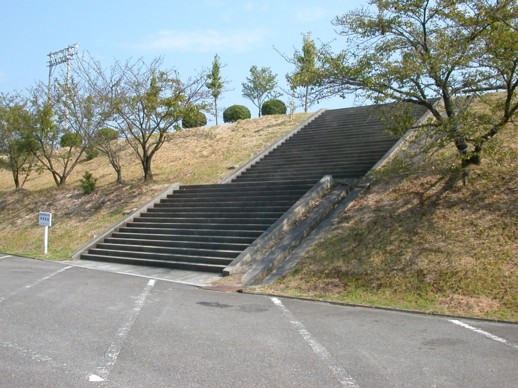 | 30 m ほど進むと,右手に球場へ向かう階段があります。 この階段を上ります。 | ![]() |