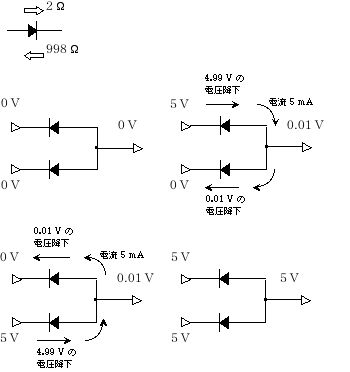 ちょっとわかりにくいと思うので,図 2.13 に具体的な例を示します。 順方向に電流を流すときの抵抗が 2 Ω(抵抗が小さい=流れやすい)であり, 逆方向に電流を流すときの抵抗が 998 Ω(抵抗が大きい=流れにくい)であるとします。 このとき,入力の電圧の組み合わせによって,出力の電圧が図 2.13 のように変わります。