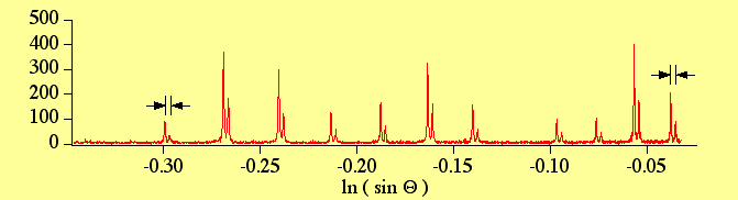 ところが,もし横軸のスケールを変更することが許されるならば, 高角のスケールを縮めてやり,低角のスケールを引き伸ばしてやれば, Kα1線とKα2線の分裂の大きさがどこでも同じになるような絵を描けそうです。 実際,横軸2Θの代わりに ln(sinΘ) というスケールをとって, 上とまったく同じデータを描くと下のような図が得られます。